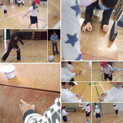 1年生は、凧あげや羽子板遊びのほかに、けん玉やコマ回し、おはじきを使った遊びを楽しんでいます。コマ回しでは、ひもの巻き方やコマを離すタイミングなど、先生が手本を示していました。
