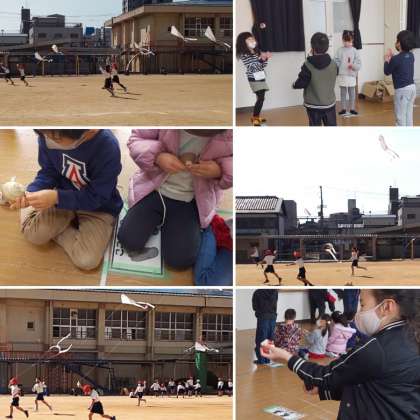 昔から子どもたちに親しまれ、伝えられてきた遊びのことを「伝承遊び」とよびます。1年生は、凧あげや羽子板遊びのほかに、けん玉やコマ回し、おはじきなどを使った遊びを楽しんでいます。