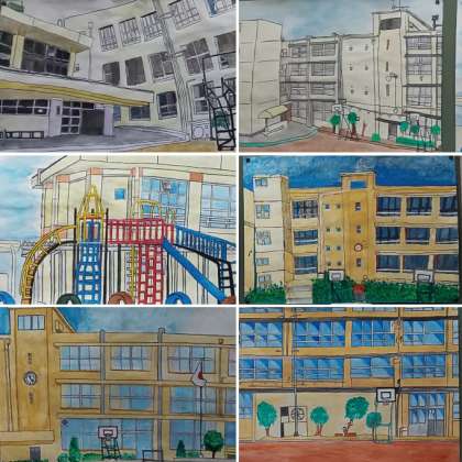 6年生の教室に上がる階段の踊り場に、6年生が描いた校舎の絵画を掲示しています。