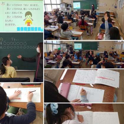 写真は2限目の1年3組のさんすうの授業「ずをつかって かんがえよう」の様子です。