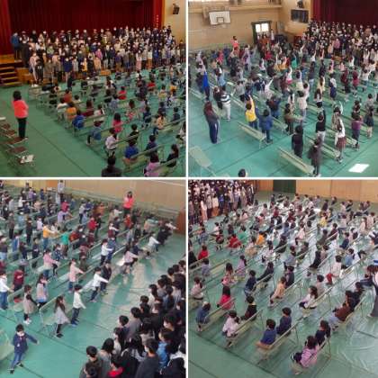 1年生の可愛い呼びかけや手話を取り入れた「にじ」の歌を、6年生はニコニコしながら受けとめていました。