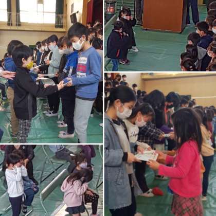 1年生から、ペア学年でお世話になった6年生に、卒業のお祝いプレゼントがありました。