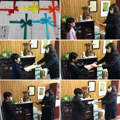 放送で、各学年に修了証を読み上げた後、学年代表の児童に一人ずつ手渡しました。