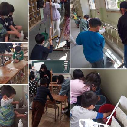 「そうじの時間に1年生の教室に行くと、靴箱とちりとりの間にすきまがあって、じょうずにごみが入れられない1年生に、6年生が『こうやってやると下に落ちないんやで。』と、とてもわかりやすく教えてあげていました。また、ぞうきんをしぼりきれずにポタポタたれてしまっている1年生に『やって見せるから見ててね。』と声をかけていました。最高学年になって、そんな一人ひとりの成長した姿が、とても嬉しく思いました。」