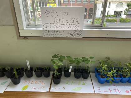 いろいろな野菜の種や葉の形や色にみんな興味津々。