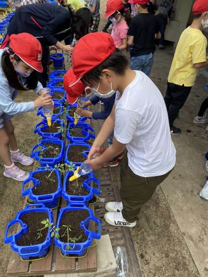 そして、一人ひとりがミニトマトの苗を植木鉢に植えました。