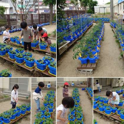大きく すくすく りっぱに育て! 登校するとすぐに、植物の水やりをしていました。