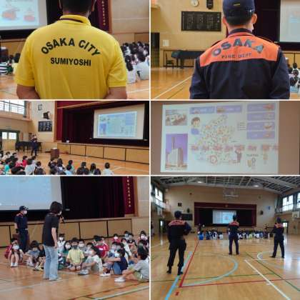 今はコロナ禍の影響で消防署の見学ができないため、出前講座として住吉消防署の方々に来校していただき、3年生を対象に防火・防災意識の向上を図るための「防災教室」を行っていただきました。