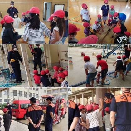 スライドや音楽を用いた消防局の紹介や、住吉消防署の仕事の紹介を、時にはクイズを交えてわかりやすく説明してくださいました。また、水消火器を使用した消火体験、毛布と物干しざおを使用した簡易担架の作成、実際の消防車のしくみの見学など、各クラスでローテーションしながら体験したり、観察したりしました。