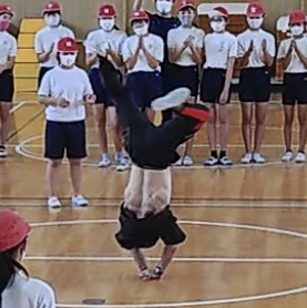 KAKUさんは、バトルの中で唯一無二、世界でKAKUさんにしかできないオリジナルの大技、「ヘッドスピンからの2000」を披露してくださり、体育館中が大興奮でした。