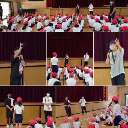 最後に子どもたちから「 何歳からダンスを始めましたか?」「 手に付けているグローブは何ですか?」などのたくさんの質問が挙がり、KAKUさんとMAOさんがエピソードやこれまでの思いを交えながら「夢」を持つこと、「希望」を持つこと、「努力」すること、「仲間」を大事にすること、などをわかりやすく語ってくれました。