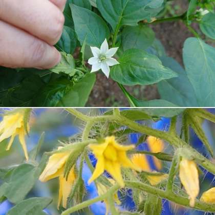 答えは、白い花がピーマン、黄色の花がミニトマトの花でした。