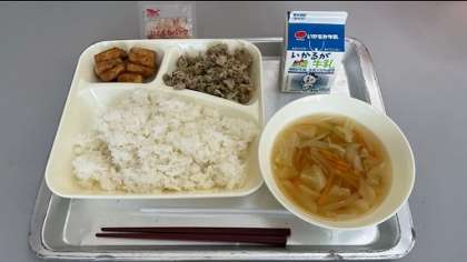 今日の給食は、「夏野菜の王様」と言われるゴーヤを使ったゴーヤチャンプルーです。