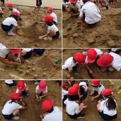 昨日の雨がちょうどいい具合に砂を湿らせてくれたおかげで、1年生は楽しく砂場で遊ぶことができました♪