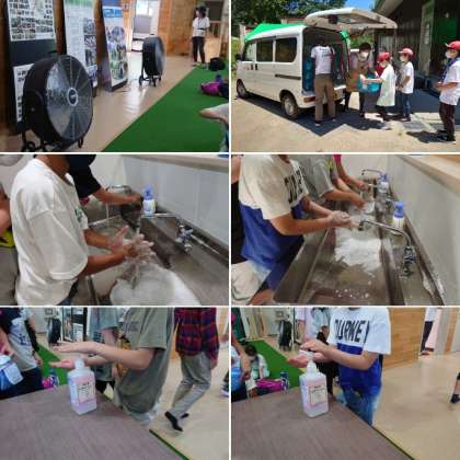 大きな扇風機を出してもらいました。 手洗い、消毒もしっかりします。