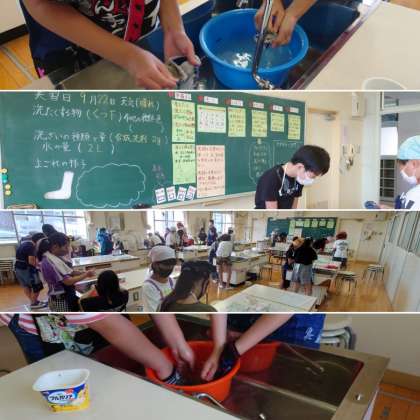 今は洗濯機を使うと、ほとんどのものが全自動できれいになる時代ですが、家庭科の授業では、「ふり洗い」「おし洗い」「もみ洗い」「つまみ洗い」「ブラシ洗い」などの手洗いについて学び、各クラス順番に実習しています。