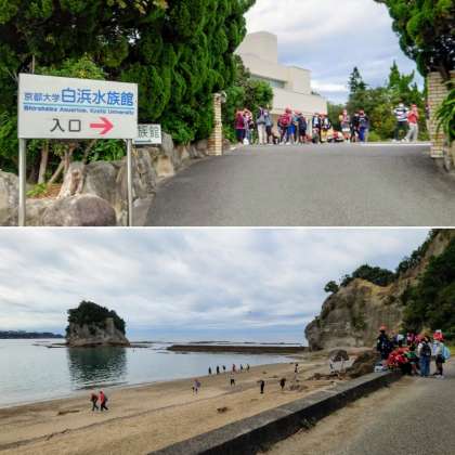 京都大学白浜水族館に到着。 近くには、有名な円月島が見えます。