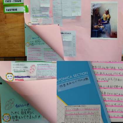 また、別の紙には違う児童が、「牛乳をそそいでいる女の人なので、『牛乳を注ぐ女』で調べました。…(略)」と自主的に今掲示しているフェルメールの作品について調べたことを書いていました。