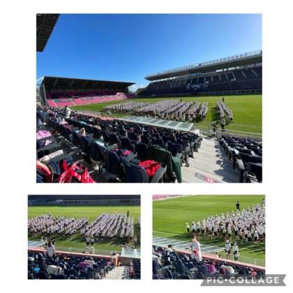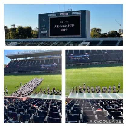 ジュニアバンドの生演奏で入場して、サッカーフィールドに全校児童がそろいました。