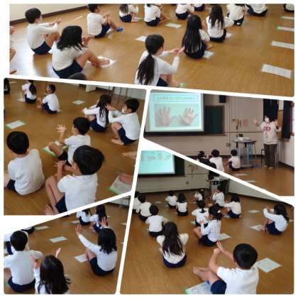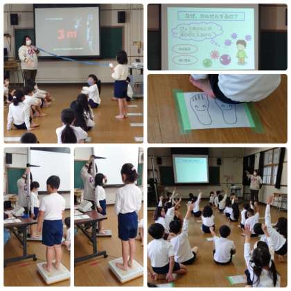 各学年の発育測定時に保健指導を行っています。今日の2年生のテーマは、今最も実行していかなければならない、感染に対する予防についてです。
