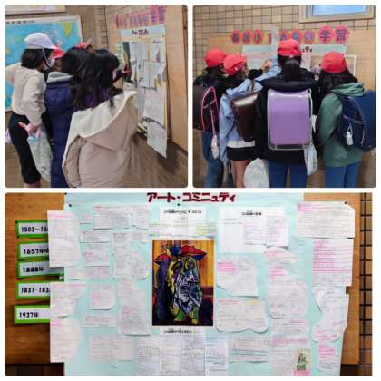 学校生活の中では、児童にもめごとの状況やけがをした時の状況を確認しても、「事実」を正しく捉える力が弱いため、聞き手に正しく伝わりにくい現状がたびたび見受けられます。そこで、今年度第1回の6年の図工(鑑賞)の研究授業を受け、絵画の鑑賞から「事実」を感じ、表現する力を付けることを目的に「アート・コミニュティ」と名付けて全校での展開を試みました。
