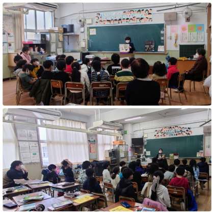 大阪市立図書館を拠点として活動しているボランティアグループ「すみよしおはなしパレット」さんが来校され、感染防止対策を講じながら1・2年生の学級を1クラスずつまわって、児童に読み聞かせをしてくださいました。