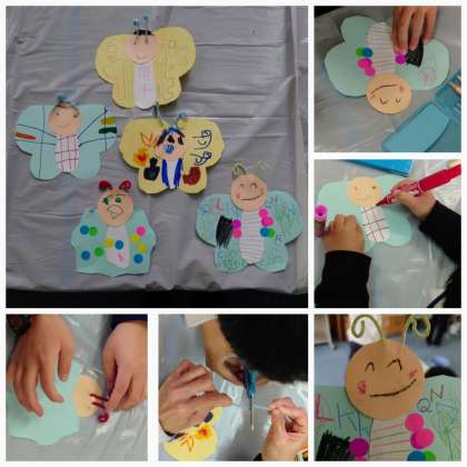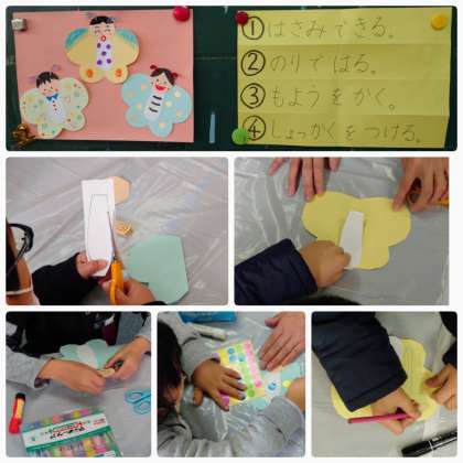 本校では自立活動の場として、毎週金曜日の2限目に「フレンドタイム」を設定しています。今日は、フレンド教室担当教員がフレンドタイムでの授業を公開しました。ハサミやのりを使ったり、サインペンや色鉛筆を自分で選んで使ったり、モールを指先で丸めたり、シールをはがして思ったところに貼ったり…、最後にはかわいいちょうちょがたくさんできあがりました*