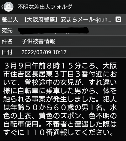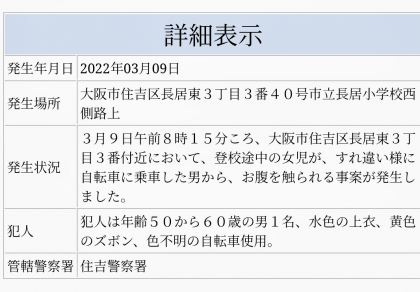 見守りで地下鉄の上り口に立っていた校長が情報を聴き、人物の確認を試みましたが既にいないということで職員室に連絡に行かせました。教頭の連絡を受けて9時過ぎには住吉警察から婦警2名を含む5名が聞き取りに来校し、状況の確認を行いました。