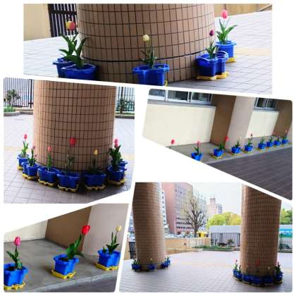 長居小学校のエントランスでは、可愛いチューリップがお出迎えします。