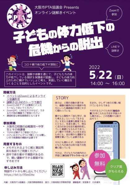 近年、コロナ禍の影響も受けて子どもたちの体力の低下傾向が進んでいる状況から、大阪市では、大阪市PTA協議会と共催で、大阪成蹊大学教育学部の協力のもと、ご家庭で子どもと一緒になって体力向上について考え、実践できる、オンライン謎解きイベント「子どもの体力低下の危機からの脱出」が開催されます。