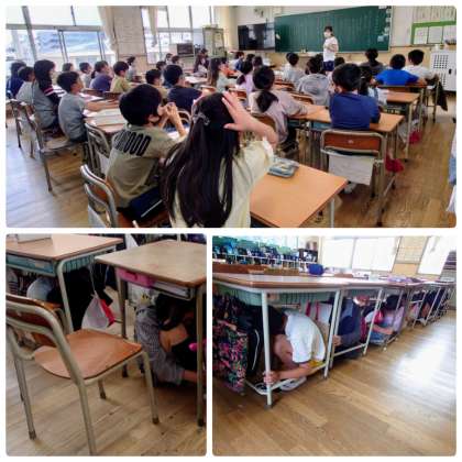 今年度初めての避難訓練のため、担任の先生から丁寧な事前指導を受けます。「地震が発生しました。机の下に隠れるなどして、静かに次の放送を待ちましょう。」という放送の合図とともに、児童は机の脚をしっかり押さえながら頭を守るように机の下に身をかがめます。