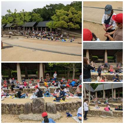 遊具の近くにお弁当を食べるのに最適な場所がありました。グループで一緒に食べます。「間隔を開けて座り、おしゃべりは控え目にしましょう」という約束です。手洗い、消毒を済ませたら、美味しいお弁当&おやつタイムです。