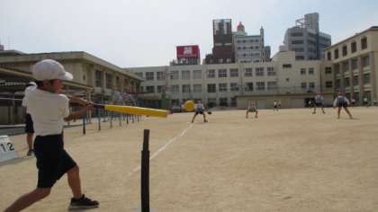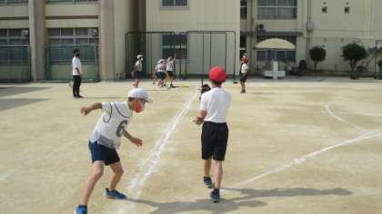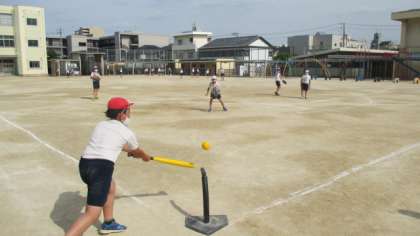 運動場に2面作ってTボールをしました。置いてあるボールを打つのはとても難しいです。守備は、打った瞬間の一歩目が大切!と、プロ野球選手のように俊敏な動きができる子がいました。