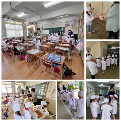 4時限目が終わってからの1年生の様子を見ていると、給食室から給食当番がきちんと並んで自分のクラスの分を運んでいき、教室でテキパキと準備を始めていました。エプロンも上手に片づけています。