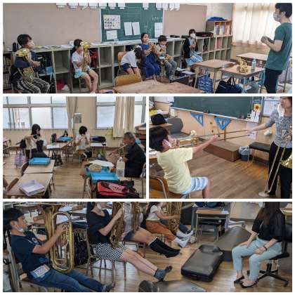 6月11日(土)、「令和4年度文化芸術による子供育成事業」より、オルカミュージックの方々にお越しいただき、楽器パート毎にグループレッスンをしていただきました。基本的な演奏の仕方から細かなテクニックまで、丁寧にご指導いただきました。楽器の手入れの仕方も教わり、「楽器をていねいに扱うことが、きれいな音色につながる」ことも学びました。ご指導ありがとうございました!