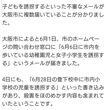 学校は、21年前の附属池田小学校の事件を教訓に子どもたちの安全を確保するために日々努めています。しかしながら最近は、「子どもを誘拐します。」といった、冗談ともいたずらとも許されないメールや脅しが大阪市内で続いています。