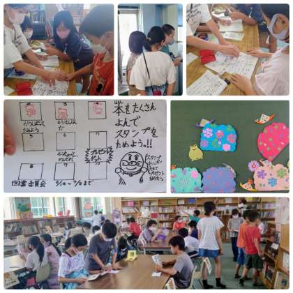 「6月14日から7月8日まで、昼休みの図書館開放に来てくれた人にスタンプカードを渡しています。スタンプを10個集めた人には、図書委員からプレゼントがあります。ぜひ本を読みに来てください。」