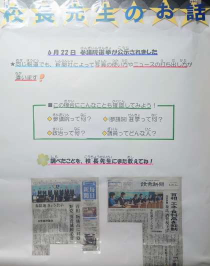 学校では、公費で購入している新聞記事から、キャリア教育に関することやクイズやパズル、時事ニュースなど子どもたちに関係することを提示しています。特に新聞の「第1面」には、各新聞社がその日、何よりも伝えたいニュースを載せています。校長室前の廊下では、子どもたちに伝えたい情報を発信しています。