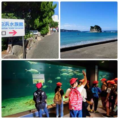 京都大学白浜水族館1 水族館に到着。 近くには、有名な円月島が見えます。