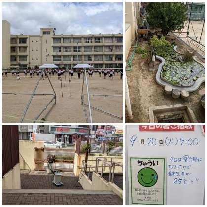 大きな被害なく、台風が通り過ぎました。気温も快適。1年生は運動場で、立ち位置を確認していました。