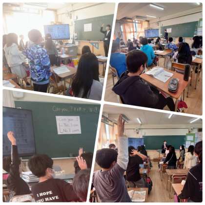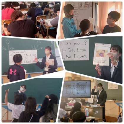 5年4組では2限目、英語科の「Can you〜?を使って、友達とたずね合おう」の授業を行いました。「Can you」の表現を理解することで、自分や相手のできること、できないこと、について表現したりたずねたりすることを学習しました。実習生の先生との会話を楽しんだり、友達同士で会話を重ねたりしながら、相手の意外な一面に驚いたり、興味を持ったりして学んでいきました。