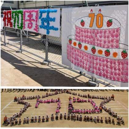 本日、本校の運動場で「70周年おめでとう 愛と平和と希望と夢と 光り輝く子どもたちと共に未来へ」をテーマに、運動会が開かれました。卒園生も種目に参加したり、準備を手伝ったりと、園児や保育園の先生と一緒に大活躍でした。