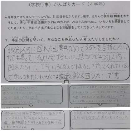 教室に戻ってからは、キャリアパスポートに今の気持ちを綴りました。児童の作文を読んだ担任の先生は、「オリエンテーリングの説明を聞いて、とても楽しみな様子がうかがえました。当日も一生懸命頑張ることと思います。」「説明を聞いて、オリエンテーリングへの意欲が増したように思います。来週が楽しみです。」と感想を述べました。
