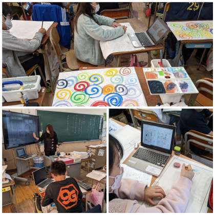 6年生は、画用紙いっぱいに海の生き物の特徴を調べてえんぴつで描き、その上に絵の具で模様を描いていました。大作の予感!