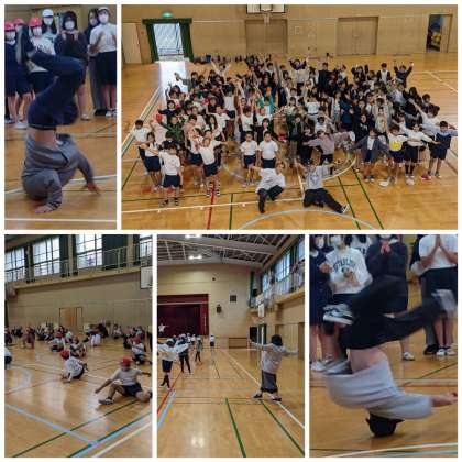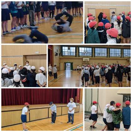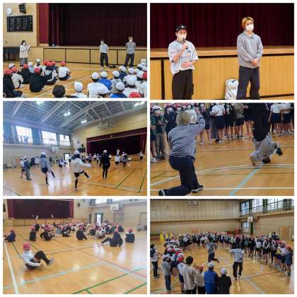 「夢授業」として、世界的なブレイクダンサー、カクさんとマオさんをお招きし、ブレイクダンスの楽しさを体験しました。校長先生から、現役ダンサーであり、世界で16人しか選ばれない大会にも出場するカクさん、ネクストジェネレーションとしてダンス、モデルと活躍の幅を広げているマオさんの紹介をすると、ようやくお二人のすごさが感じられたのか、目をキラキラさせてきた子どもたち。実際にブレイクダンスを目の前で見せていただくと、興奮も最高潮!歓声と拍手がいっぱいでした。(このお二方は、なんと長居小学校に3年連続で来てくださっています!)
