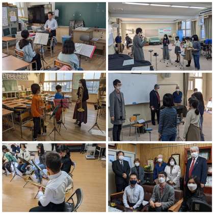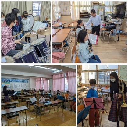 本日、Osaka Shion Wind Orchestra(公益社団法人 大阪市音楽団)から、齋藤様と、3人の演奏家の方をお招きし、長居ジュニアバンドの子どもたちに、直接ご指導をいただきました。今回お招きできたのは、長居地域活動協議会のご尽力のおかげです。心より感謝申しあげます。長居地域活動協議会の方々にもご来校いただき、子どもたちが熱心に練習している様子をご覧いただきました。