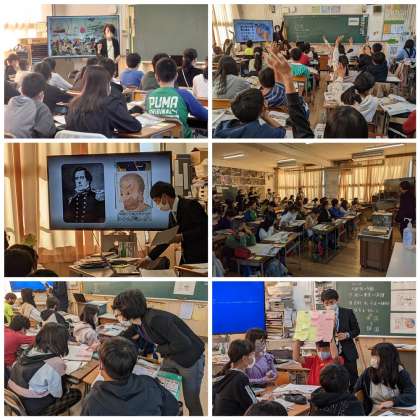 授業では、「黒船が来航し、幕府はアメリカと条約を結び、開国した」という日本の歴史を、大名の立場で、『賛成』『反対』の考えを述べ合いました。根拠をもって意見を述べる児童も多く、教科書と資料をもとに考えを深めていきました。