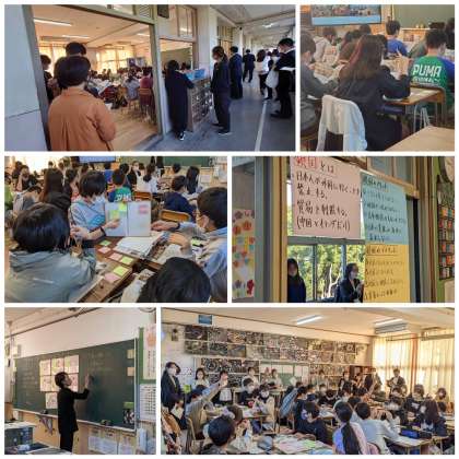 本校は教育センターにおける「言語能力育成モデルの研究協力校」として、言語能力を高める指導法の研究に努めています。本日は、6年生が社会科の公開授業を行いました。全市小・中学校の先生と本校教員合わせて、約80名の参観がありました。教育センターからも5名の先生が来校されました。たくさんの先生に囲まれながらも、児童は、自分の意見を堂々と発表し、学習できました。