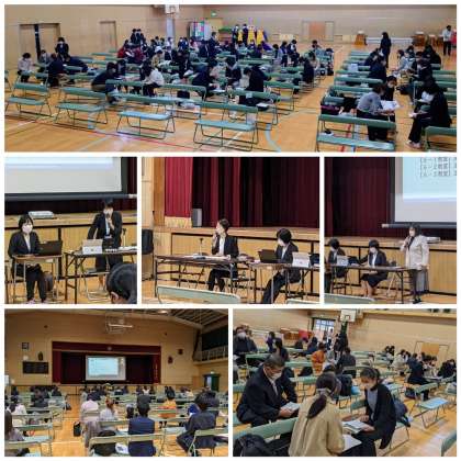 授業後には、研究討議会行いました。グループに分かれて「言語能力の向上につながる指導者の働きかけ」について、熱い議論が繰り広げられました。東京学芸大学の犬塚先生から、オンラインで講評と講話をいただきました。教科書を読んでさらに考える授業の大切さなど、言語能力を高めるためのポイントをご教示いただきました。