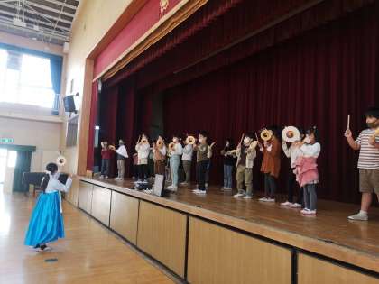 舞台では、ソンセンニムに、ソゴという楽器を使った踊りを教えていただきました。音楽に合わせてソゴをたたき、楽しそうに踊る姿が印象的でした♪